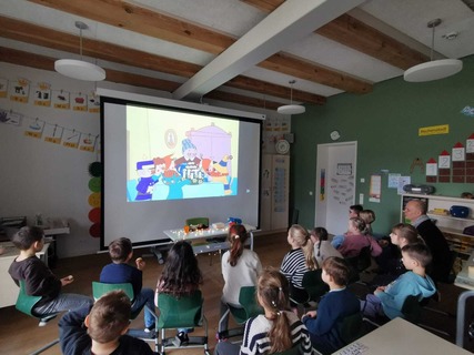 Begleitend zum Vorlesen konnten die Kinder das passende Bilderbuchkino ansehen, das die Geschichte auf eindrucksvolle Weise lebendig werden ließ. Besonders schön war, dass das Buch im Anschluss als Geschenk für die Klassenbibliothek überreicht wurde. Vielen Dank für diese tolle, inspirierende Vorlesestunde!