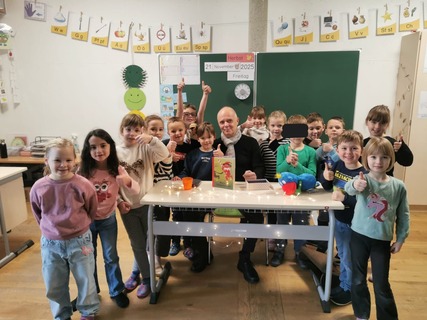 Zum Vorlesetag durfte die Klasse 1b einen ganz besonderen Gast begrüßen: Maltes Opa Ronald. Gemeinsam mit seinem Freund Sepp, der lustigen Handpuppe, las er aus dem Buch „Alarm im Kasperle-Theater“ vor – einer Geschichte, die er früher schon Maltes Mama vorgelesen hatte. Die Kinder hatten viel zu lachen, besonders über das kleine Teufelchen, das im Buch über Bauchweh klagt, weil es alle Pfannkuchen geklaut und allein verspeist hat.