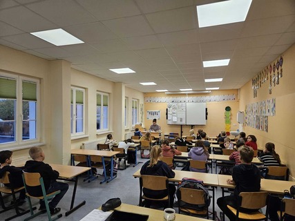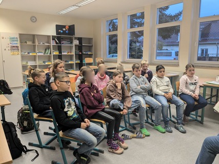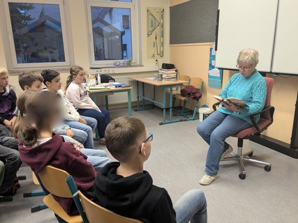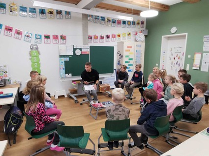 Die Klasse 2a bekam auch in diesem Jahr wieder Besuch von Herrn Biebach. Er las aus dem Buch "Die große Wörterfabrik" vor. Passend zum Buch erfuhren die Kinder, wie viele Wörter die Deutsche Sprache hat und wie viele Sprachen es überhaupt auf der Welt gibt. Mit spannenden Fragen wie "Welche 5 Wörter würdest du dir aussuchen, wenn du nur noch diese 5 bis zum Rest des Lebens benutzen dürftest?" regte Herr Biebach die Kinder zum Nachdenken und Philosophieren an. Danke für die tolle Vorlesestunde! Zum Abschluss nahmen die Kinder noch voller Freude ihre Bücher entgegen, welche sie sich im Rahmen der Aktion „Lesen ist Leben“ selbst aussuchen konnten. Für den Rest der Stunde konnten dann alle noch fleißig in den neuen Büchern schmökern.