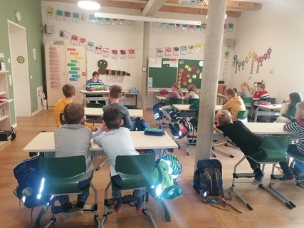 Die erste Klasse kam in den Genuss, die Geschichte „Alarm im Kasperletheater“ in der ersten Stunde zu hören. Frau Günther, die Mama eines Kindes der Klasse, hat uns die lustige Geschichte vom Teufelchen, der die Pfannkuchen für Omas Geburtstagsfeier gestohlen hat, vorgelesen. Die wilde Verfolgungsjagd, bei der der Teufel die anderen Figuren aus dem Kasperletheater austrickst, hat für einige Lacher bei den Kindern gesorgt. Für viel Begeisterung sorgte auch der kurze Film dazu, den sich die Kinder im Anschluss an das Vorlesen anschauen konnten.