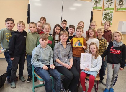 Die Vorleserin in Klasse 3b wurde gleich beim Betreten des Klassenraumes mit herzlichen Worten empfangen. Die Kinder kennen Frau Hühne von der Kita / dem Hort in Lindenau. Außerdem leitet sie seit vielen Jahren das „Bücherstübchen“ im Torhaus und weiß genau, mit welcher Art Büchern sie die Kinder begeistern kann. So begann sie, nach dem Einläuten mit der Klangschale, das Vorlesen der Geschichte von Mirko, der sich so gerne eine eigenen Hund wünscht. Die Kinder hörten aufmerksam zu, als der Junge mit dem Hund Lui das ein oder andere Abenteuer erlebte. Und natürlich fieberten alle Drittklässler mit und wünschten sich, dass der Hund schon bald bei Mirko wohnen dürfte. Und auch wenn, wie im wahren Leben, nicht alle Wünsche in Erfüllung gehen, fand die Geschichte doch ein gutes Ende.